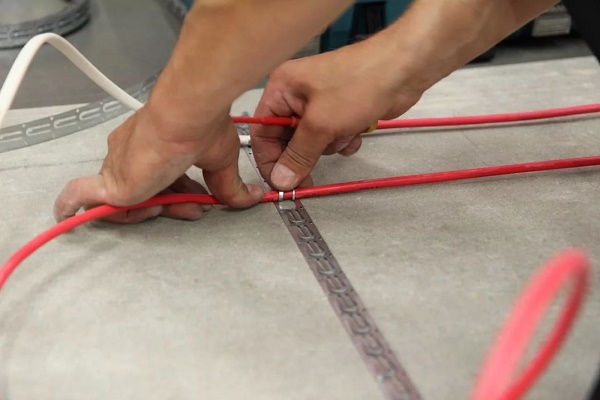 - Kablo, bağlantı plakalarına plastik kelepçeler veya "antenler" ile sabitlenir, böylece halkaları parazit olmadan bükülür ve aynı zamanda diğer ısıtma elemanları ile kesişmez. Son kaplin alanında döşeme tamamlanmıştır.