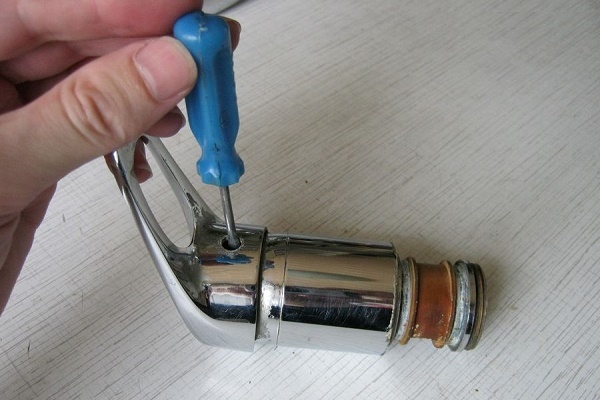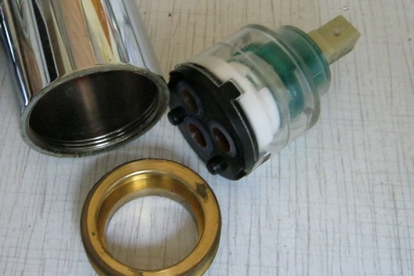- Dar bir çalışma parçasına sahip bir anahtar veya düz uçlu pense kullanarak, seramik kartuşu tutan bir sıkıştırma pirinç somunu sökülür.