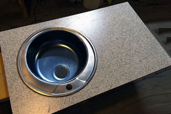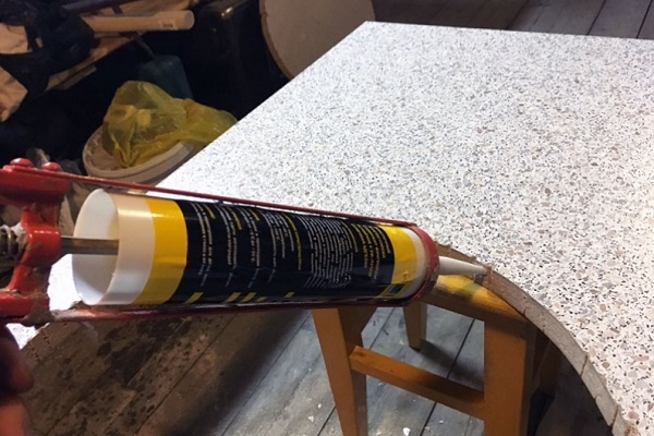 Sızdırmazlık maddesi yoksa, tabanın kesimini işlemek için sıradan PVA tutkalı kullanabilirsiniz. Aynı etkiyi verecektir. Yapay taştan yapılmış tezgahta, elmas kaplı bir diskin takıldığı bir öğütücü kullanarak gerekli deliği kesebilirsiniz.
