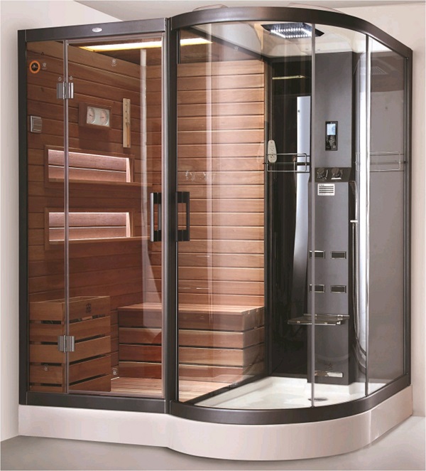 Kombine kabinlerde sauna genellikle içte ve dışta doğal ahşap ile bitirilir. Bu ona “otantik” bir görünüm kazandırır, hijyenik prosedürleri daha da kullanışlı ve eğlenceli hale getirir.