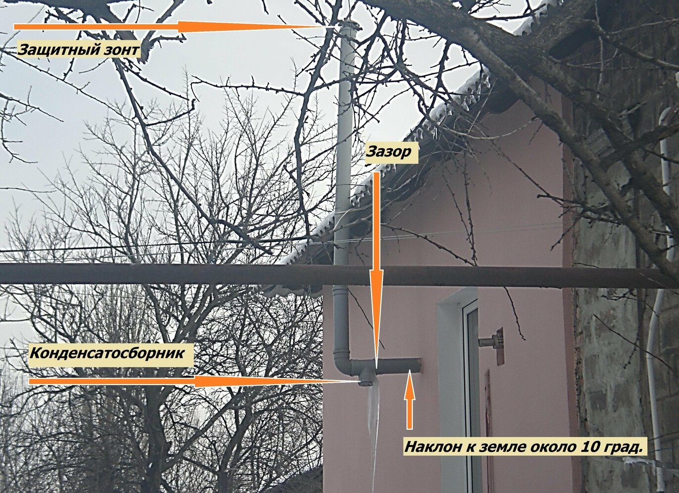 Kışın, durum biraz değişiyor - buz sarkıtları ortaya çıkıyor ve bir konide geniş bir alanı kaplıyorlar. Evdeki hava, şiddetli bir dondan birkaç gün sonra buzu ısıtır ve düşer. Tişörtün alt borusunun uzunluğu yeterlidir, böylece bu süre zarfında su dallanma seviyesine ulaşmaz. Buz oluşumuna dikkat edin ve gerekirse bir sopa ile vurun.