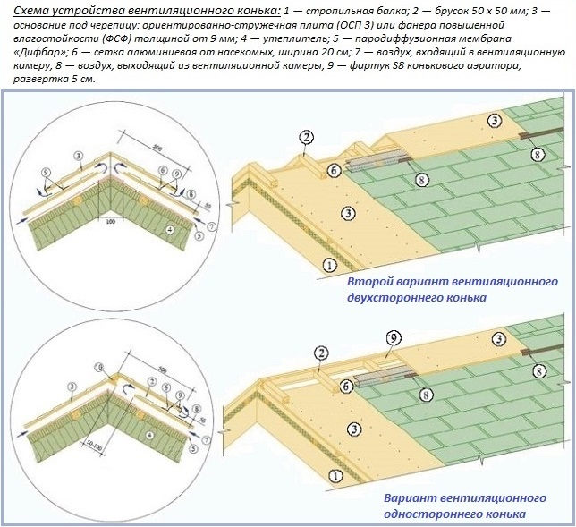 İnşaat piyasasında, çeşitli üreticilerin sırt havalandırıcılar için birçok seçenek vardır. Bununla birlikte, cihazlarının prensibi benzerdir: havalandırıcı, hava çıkışı için bir boşluk oluşturan plastik bir yapıdır. Caddenin yan tarafından, havalandırıcı böceklerin ve kuşların içeri girmesini önleyen bir ağ ile donatılmıştır.