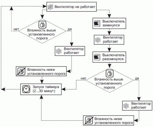 Fandaki nem sensörü hem zamanlayıcıda hem de otomatik olarak çalışabilir. İkinci durumda, odadaki nem seviyesi normu aştığında egzoz sistemi açılır.