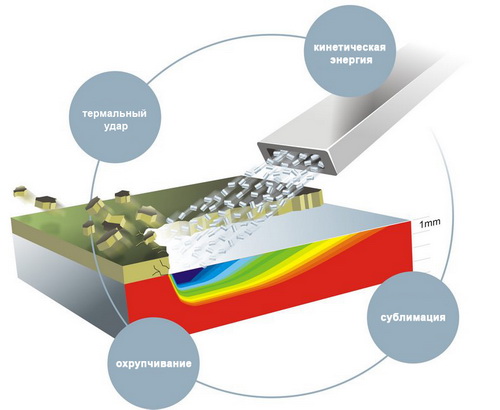 Özünde, bu nispeten yeni yöntem bir tür kimyasal saflaştırmadır. Bununla birlikte, patlatma etkinliği ve yumuşak hareketi nedeniyle özel dikkat gerektirir. İşlem, duvarları temizlemek için en uygun özelliklere sahip olan kuru buz olarak adlandırılır.
