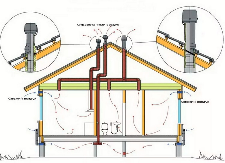 Özel evlerde, banyolardan çıkan egzoz kanalları ve ocak davlumbazlar çatı katında ayrı olarak gösterilir veya binanın ortasında bulunan ortak bir şafta indirgenir. Böylece, yararlı alan kaybı azalır ve şaft en yüksek noktada çatıya gider, bu da mükemmel çekiş sağlar.