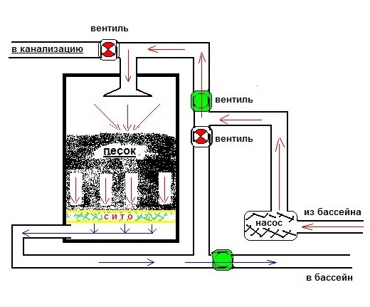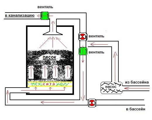İlk durumda, filtrenin giriş odasında, suyu dolgudan zorlayan küçük bir basınç oluşur. İkinci durumda, sıvının drenaj odasından emilmesi, üst kısımda küçük bir basınç oluşturur, böylece havuzdan su sisteme emilir.