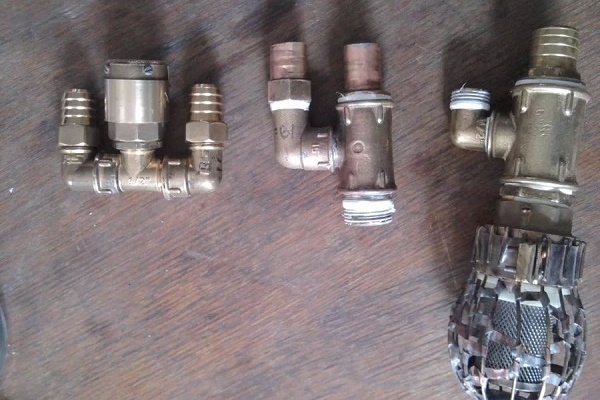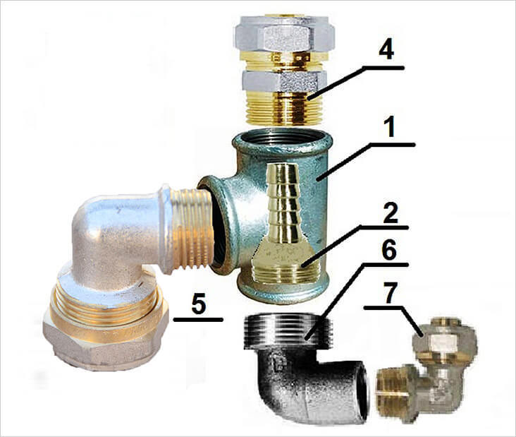 İki elemanın aynı anda tişörtün alt branşman borusunun iç dişine bağlandığı ortaya çıkıyor. Bunlardan biri (bağlantı elemanı) tee'nin içinde ve ikincisi (köşe) dışarıda. Her ikisinin de aynı dişli bağlantıya oturması için bağlantı parçasının parçasının bir kısmını kesin.