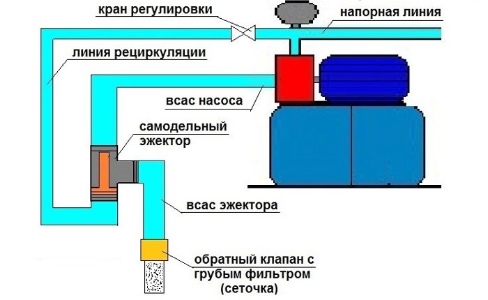 Ancak uzak ejektörün kurulumu daha karmaşık bir şemaya göre yapılır. Başlamak için, sürücüden ejektöre ters su akışı sağlayacak bir boru takılması gerekecektir. İtici setinin emme bölümünde çek valf. Cihazı tıkanmaya karşı korumak için bir süzgeç konulmalıdır.