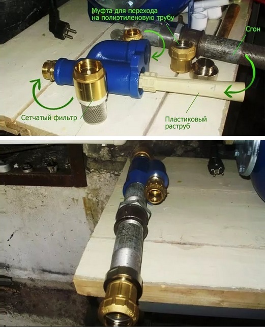 Tabii ki, tüm dişli bağlantılar mühürlenmeli ve mühürlenmelidir. Çoğu zaman, bunun için FUM bant kullanılır. Bazen ejektörü bağlamak için pompa istasyonu metal plastik borular kullanılmaz, polietilen yapılar kullanılır.