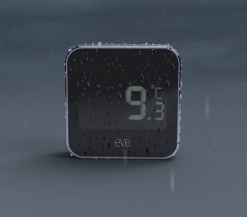 Station météo Eve degré Détecte et affiche la température, l'humidité et la pression atmosphérique. Alimenté par des batteries au format CR2450. Écrit des données dans le service cloud d'Apple.