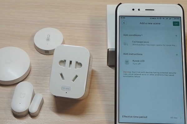 Pour assurer la sécurité dans la maison en cas d'intrusion pénétrant à travers la porte / fenêtre, vous pouvez utiliser le tas de capteur de capteur de porte / fenêtre, ampoule, caméra Xiaomi Yi, qui commence à enregistrer la vidéo lorsque la lumière est allumée et envoie un clip vidéo d'une durée de 6 secondes à votre smartphone.