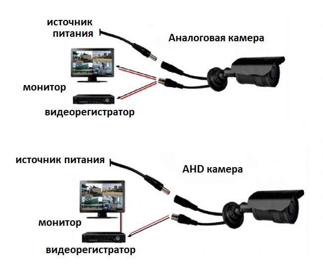 Ce format est le plus simple - il y a une caméra dans le circuit et deux conducteurs y sont connectés. L'un d'eux est alimenté, l'autre - un signal est pris. L'image de sortie n'est pas de très bonne qualité.