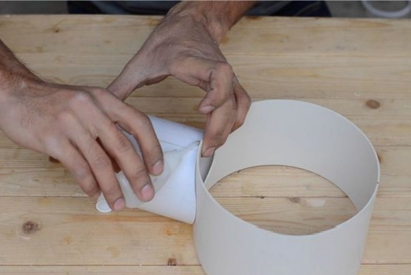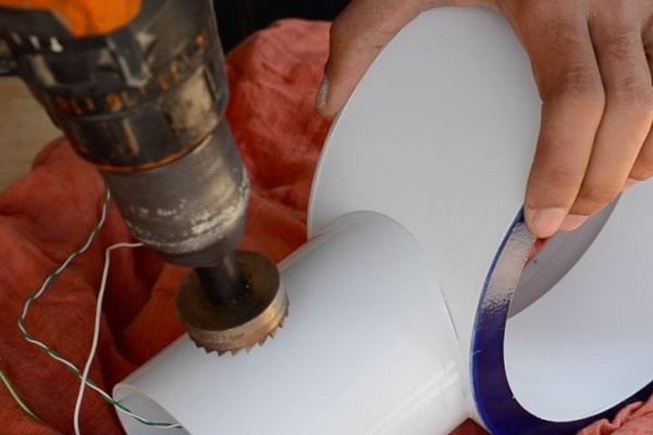 Il faut maintenant assembler le carter avec le moteur, dont le rôle sera assuré par le ventilateur axial. Pour ce faire, placez un capuchon sur le côté du tee, après y avoir préalablement appliqué une couche adhésive.