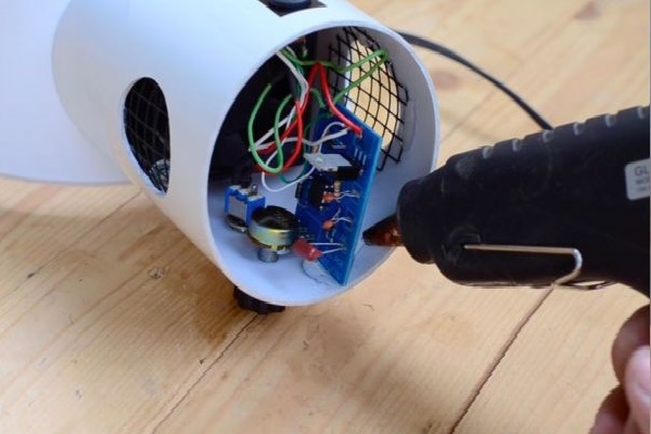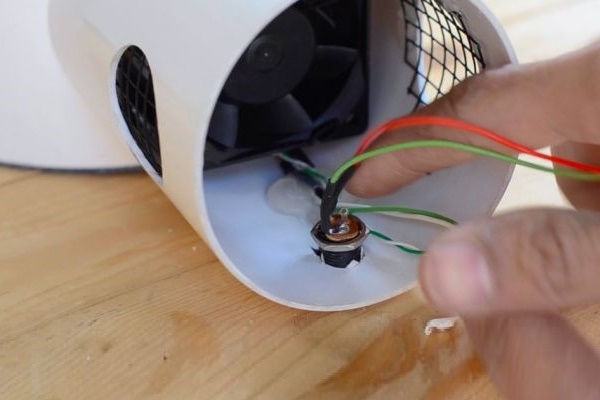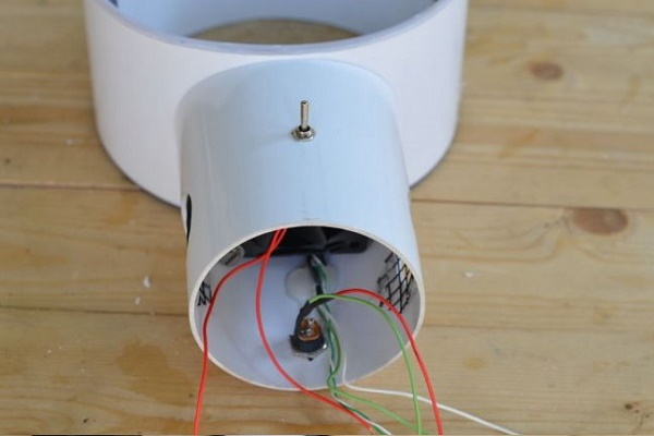 C'est ici qu'un ventilateur électrique axial du diamètre souhaité doit être installé, et un fil est inséré dans le trou pour inclusion dans le réseau électrique.