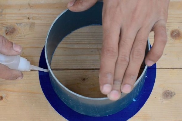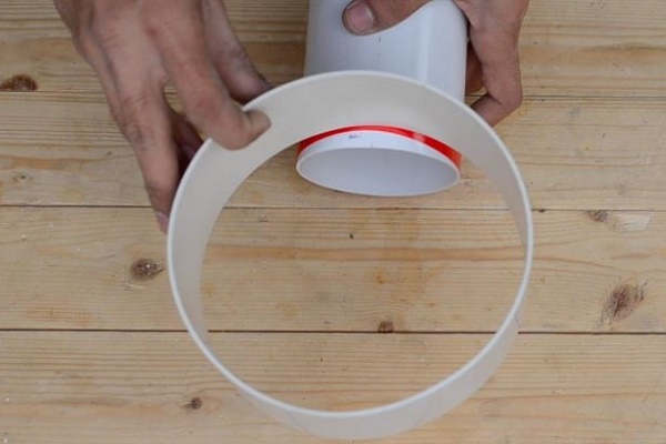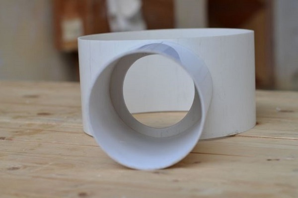 Il est préférable de laisser un petit espace de 1,5 à 2 cm pour qu'il y ait un accès d'air. Ensuite, vous devez mettre le tuyau en PVC sur l'une des buses du tee et marquer la bordure - ce sera un segment d'environ 10 cm, qui sera coupé.