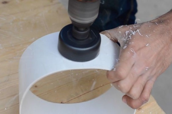Vous devez d'abord couper un morceau de 15 cm de long du tuyau, puis, dans un seau de 10 litres, faire un trou sur le côté exactement de la même taille que le diamètre extérieur du tuyau.