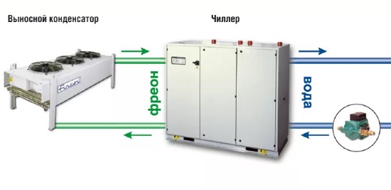 Ici, l'énergie thermique est transférée à l'aide d'eau ordinaire. Pour éviter sa congélation, un mélange d'antigel, par exemple d'antigel, peut être utilisé. Le refroidisseur fonctionne grâce à l'évaporateur, au compresseur et au condenseur qui en font partie.