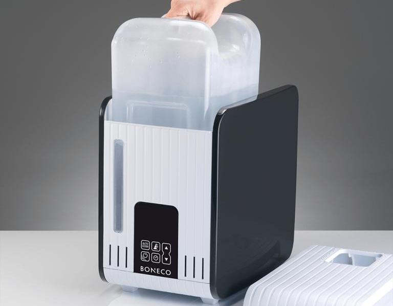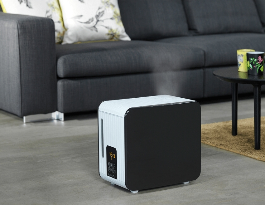 Caractéristique d'entretien: pour verser dans le réservoir, il est préférable de prendre de l'eau distillée afin que les pièces de l'appareil ne tombent pas en panne à cause des dépôts. Si l'appareil est placé près d'un appareil de chauffage (par exemple, un radiateur électrique ou un radiateur de chauffage central), l'efficacité de l'humidification augmentera.
