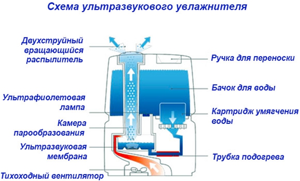 La fréquence ultrasonore sous forme de vibrations est transmise à l'eau qui, dans une chambre spéciale, est divisée en de nombreuses petites gouttelettes. Ensuite, un environnement humide ressemblant à du brouillard ou à un aérosol est expulsé par un courant d'air créé par un ventilateur.
