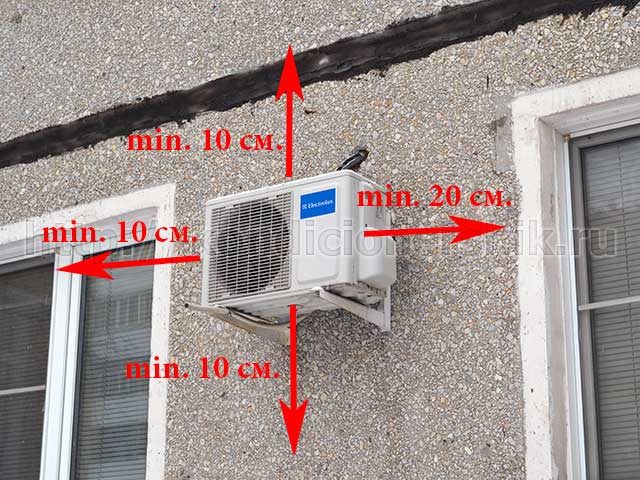 Pour la libre circulation de l'air et l'inadmissibilité d'une surchauffe, l'unité est placée à une distance d'au moins 15 cm du mur et de 20 à 30 cm de l'obstacle le plus proche, de préférence du côté de l'ombre. L'installation sous une fenêtre avec un ouvrant est faite pour faciliter l'entretien.