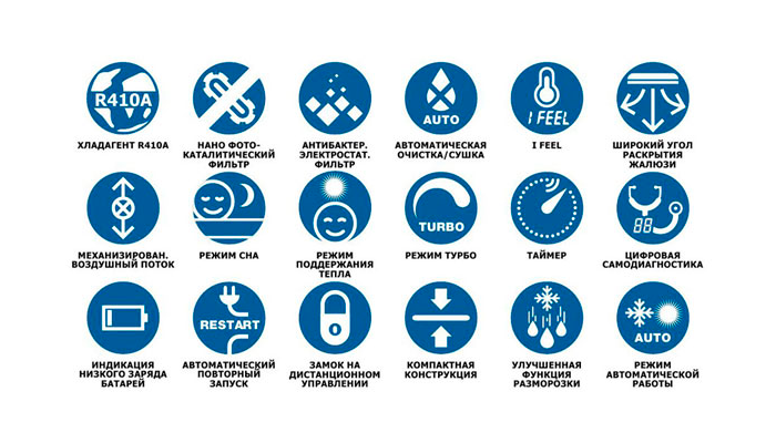 - chauffage - chauffe l'air de la pièce en basse saison, mais pour un fonctionnement en hiver à une température extérieure inférieure à -5 ° C, l'appareil doit être équipé d'un kit spécial qui protège l'unité extérieure du gel;