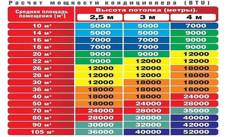 La capacité de refroidissement est calculée individuellement. Pour les locaux résidentiels de taille moyenne avec des plafonds dont la hauteur ne dépasse pas 3 métros, ce paramètre est déterminé en divisant la superficie totale par 10.