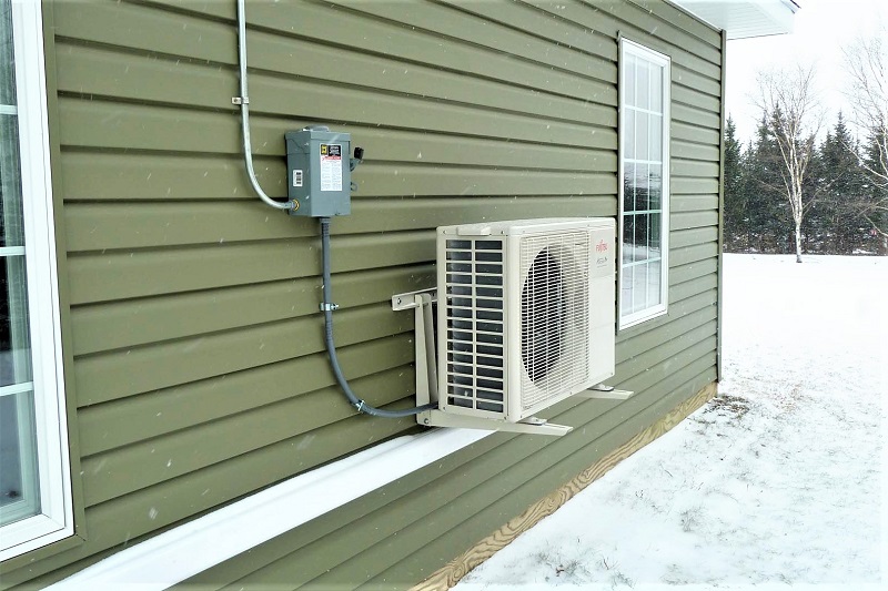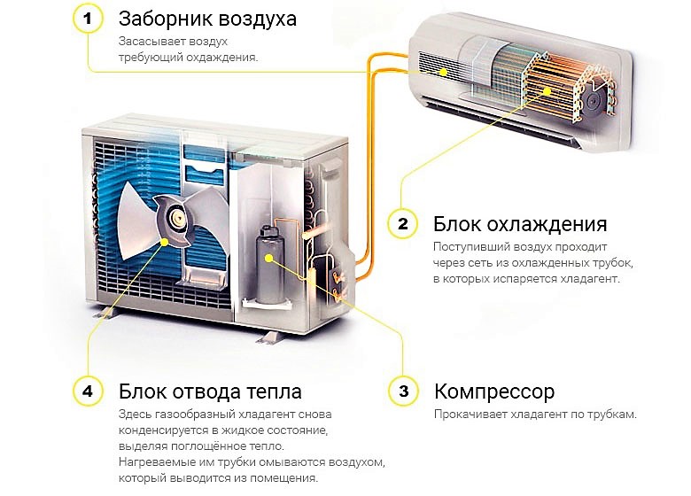 Le compresseur est couplé avec un condenseur situé dans l'unité extérieure, l'évaporateur dans l'unité intérieure. Les deux modules sont reliés par des tubes en cuivre au réfrigérant en circulation.