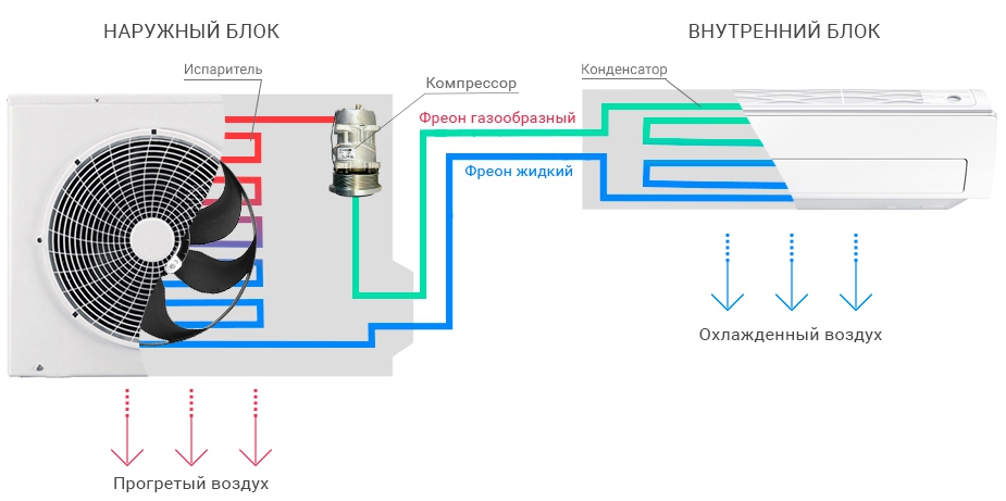 L'unité extérieure qui dégage de la chaleur dans la rue comprend un dispositif de préparation de fréon à haute pression et un échangeur de chaleur-condenseur externe. Et le module à l'intérieur de la pièce a un filtre à air, un échangeur de chaleur-évaporateur, un ventilateur et une pompe de drainage avec un bac à condensats.