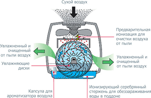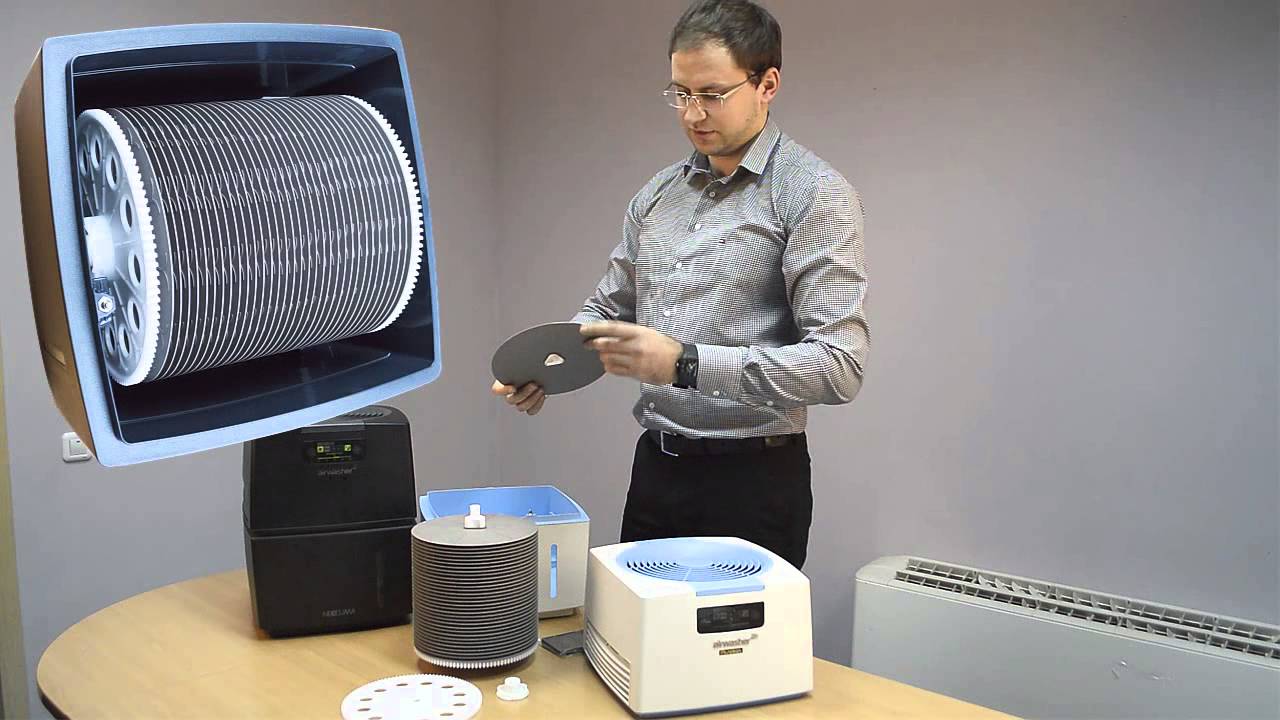 La poussière qui pénètre dans l'appareil se dépose sur les disques et est ensuite lavée à l'eau. Dans les complexes climatiques, un humidificateur mécanique est généralement mis en œuvre, mais récemment des systèmes avec des appareils à ultrasons sont également apparus en vente.