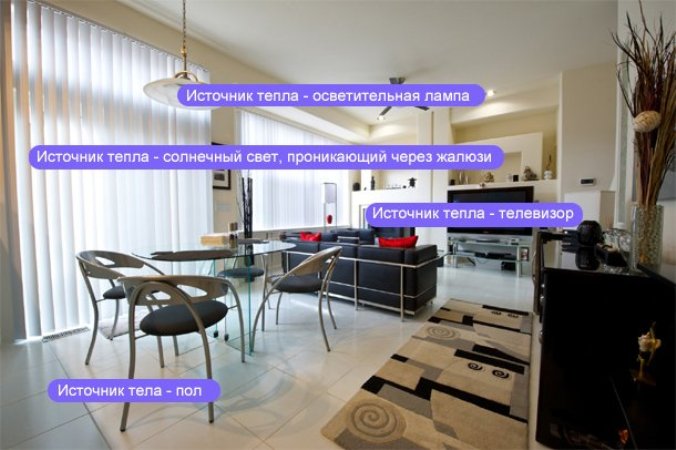 La valeur obtenue est ajustée en fonction du nombre de résidents ou de travailleurs, de la surface du vitrage et du nombre d'équipements électriques (flux de chaleur d'une personne 0,1-0,3 kW, d'un équipement 0,2-0,5 kW).