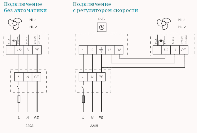 Le régulateur de vitesse est connecté au câble alimentant le ventilateur, selon le schéma du constructeur. L'objectif principal est de couper les fils de phase, de zéro et de terre et de connecter les fils aux borniers d'entrée et de sortie, en suivant les recommandations. Dans le cas où le ventilateur possède son propre interrupteur séparé, il devra être remplacé par un régulateur, après avoir démonté le premier selon les besoins.