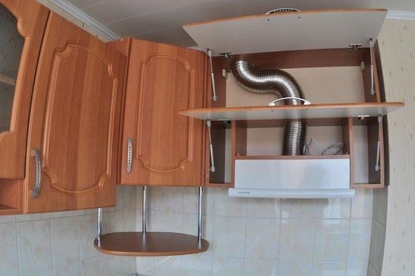 Parfois, ce n'est clairement pas suffisant. Ensuite, les propriétaires connectent l'imagination, en choisissant l'option la plus optimale, par exemple, cacher le tuyau dans les armoires suspendues. Ce qui est particulièrement vrai pour hottes encastrables.