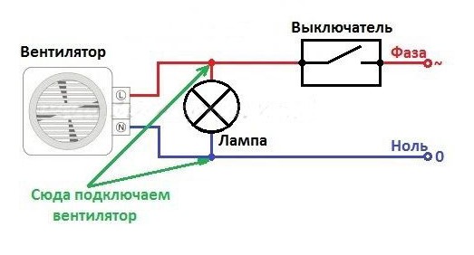 L'option la plus simple et la plus économique pour organiser la ventilation forcée de la salle de bain est de connecter le ventilateur à l'ampoule la plus proche, en dépensant un minimum de fils et d'efforts. Dans ce cas, la hotte fonctionnera exactement tant que la lumière est allumée.