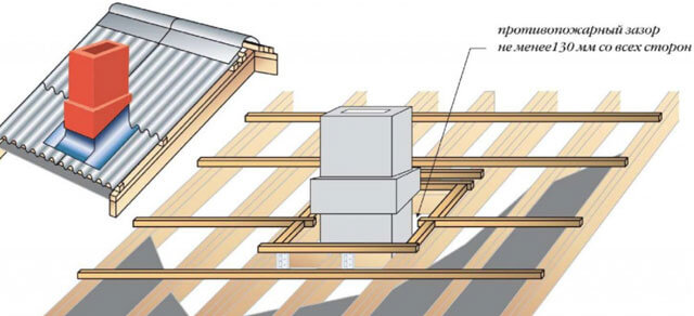 Afin de faire face au problème de la hauteur élevée du tuyau de ventilation, vous pouvez réaliser un revêtement supplémentaire en contreplaqué. Pour les structures particulièrement grandes ou lourdes, un cadre supplémentaire de poutres en bois est réalisé. Alternativement, vous pouvez installer un tronçon de câbles métalliques, qui fixera solidement le tuyau sur le toit.