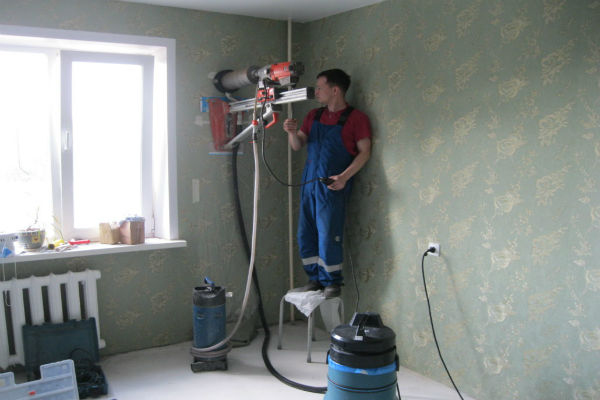 - Un trou légèrement incliné vers l'extérieur doit être percé dans le mur. Pour les murs en briques, une perceuse ordinaire convient, mais pour les maisons en panneaux, vous devrez utiliser la procédure de forage au diamant. Dans ce cas, il est conseillé d'utiliser un aspirateur avec un anneau de captage.