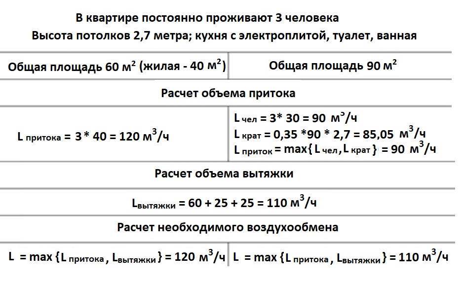 Dans le calcul, vous ne pouvez pas simplement résumer les chiffres. Pour les pièces à vivre, l'échange d'air est compris comme l'apport d'air extérieur et son écoulement dans la cuisine, la salle de bain, etc., et pour les locaux techniques - l'afflux des pièces d'habitation et le dégagement à l'extérieur de l'appartement.