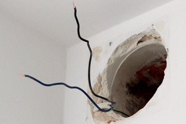 Sous le fil, vous devez faire une rainure ou un trou spécial. Le ventilateur lui-même a un trou pour les fils. Vous devez installer le ventilateur en place et tirer le fil vers la surface.