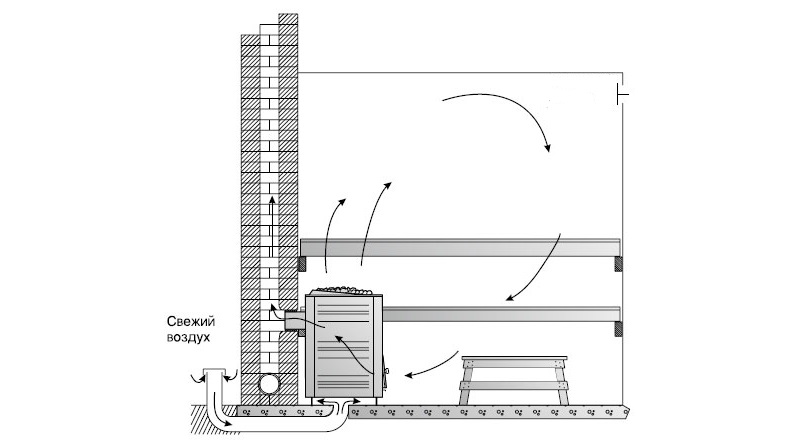 Le plus souvent, un cendrier est placé dans la salle de relaxation, et la partie fermée du four est envoyée au hammam. Ensuite, sous le plancher du hammam, vous pouvez placer un tuyau pour extraire l'air évacué, une ouverture au mur la plus éloignée de la salle de repos. Apportez l'extrémité opposée de ce conduit d'évacuation au cendrier dans la salle de repos. Le tirage du four évacuera l'air du bâtiment beaucoup plus rapidement que le tuyau d'échappement du hammam.