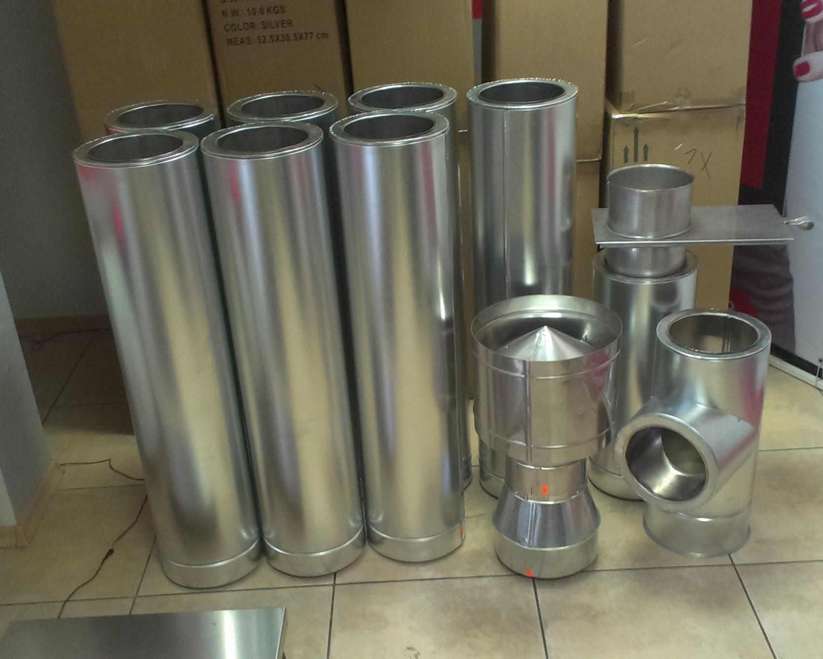 Nous collecterons les éléments l'un dans l'autre. Nous ferons des sandwichs avec isolation à partir de tuyaux de différentes largeurs - au niveau du grenier et du toit. Connectez l'adaptateur au canal à peu près au niveau du plafond. Il est préférable de prendre le portail avec un amortisseur rotatif plutôt que rétractable. Ce sera plus pratique.