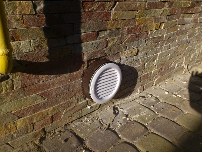 Dans ce cas, deux planches sont retirées de la planche pour la circulation de l'air. Pour créer des conditions pour la hotte, une planche est retirée. Dans les coins opposés du service d'inspection, placez les conduits de ventilation d'alimentation et d'évacuation. L'extrémité du tuyau d'entrée est laissée à une distance moyenne de 25 cm du sol.