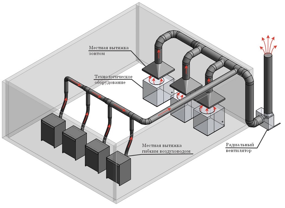 Le premier est utilisé pour éliminer les substances nocives directement du lieu de travail. Il est avantageux de l'utiliser pour localiser la pollution lorsque les équipements sont éloignés les uns des autres dans toute la zone de la pièce.