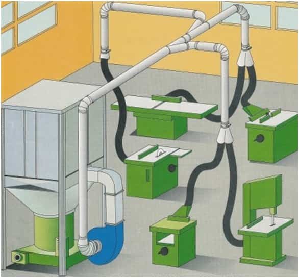 Appliquer également options de ventilation hybridelorsqu'une partie des machines est connectée à un système commun et qu'une partie a un filtrage local. Dans certains cas, en principe, ils préfèrent uniquement les systèmes locaux pour empêcher la dispersion des poussières fines et autres substances toxiques dans l'atelier.