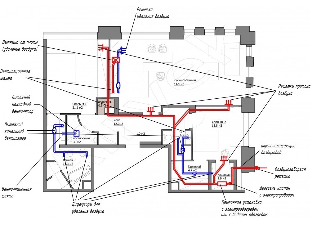 Sur le schéma, vous devez appliquer les conduits de ventilation de l'air soufflé et évacué, qui traverseront les pièces. Il est impératif d'indiquer où seront situées les vannes d'entrée, les ventilateurs, les récupérateurs et les autres équipements prévus dans le système de ventilation sélectionné.