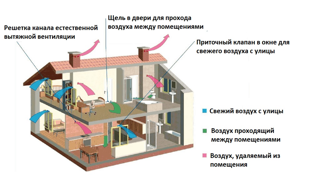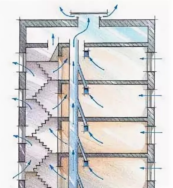 L'air frais est fourni par des fenêtres, des évents, des portes ou des vannes spéciales. Élimination des masses de déchets - grâce à des conduits d'évacuation installés dans la cuisine ou dans la salle de bain.