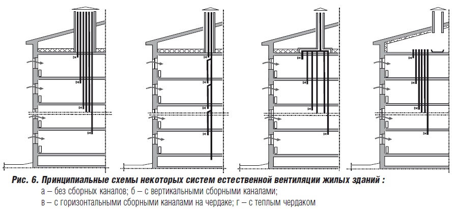 Les immeubles d'habitation utilisent une ventilation naturelle. Dans chaque appartement (dans la salle de bain, les toilettes, la cuisine, le garde-manger), il y a des conduits d'évacuation à travers lesquels l'air usé sale quitte la pièce. Des courants d'air pur pénètrent dans l'appartement par les fenêtres, des fissures dans les fenêtres et les portes.