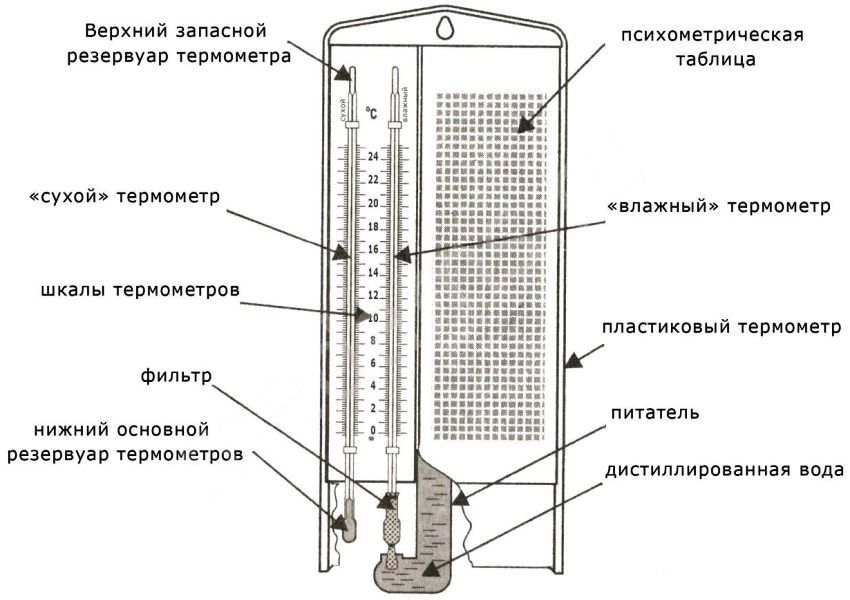 Hygromètre de type psychométrique. Cet appareil fonctionne sur le principe de l'interaction entre deux thermomètres (sec et humide). Les lectures affichées sur l'échelle des thermomètres doivent être vérifiées avec un tableau spécial et calculer les données exactes sur l'humidité dans la pièce.