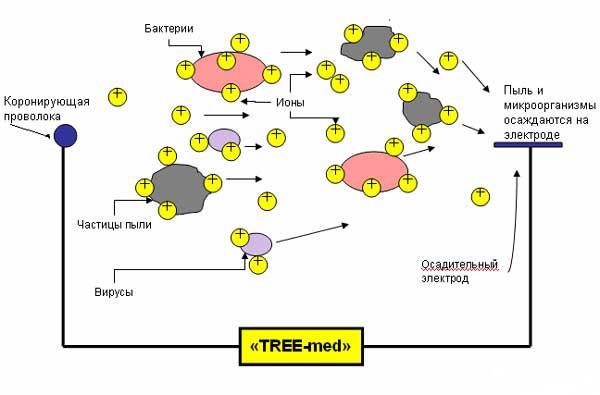 Le principe de fonctionnement des appareils de ce type est similaire aux analogues traditionnels. La seule différence est que le flux d'air dirigé nettoyé mécaniquement entre dans la chambre d'ionisation, dans la cavité dont il acquiert une charge positive.