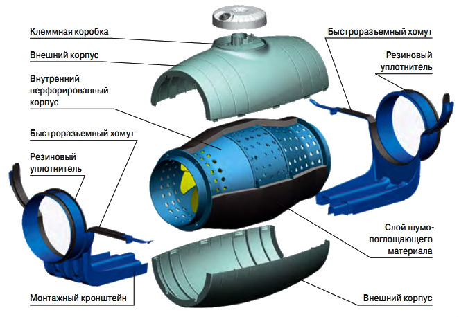 Aujourd'hui, il n'est pas rare de finir des gaines de ventilation avec des matériaux modernes insonorisés. Réduit le bruit et le montage fiable du moteur sur le boîtier. Les centrales électriques elles-mêmes sont conventionnelles et sont utilisées sur tous les types de ventilateurs.