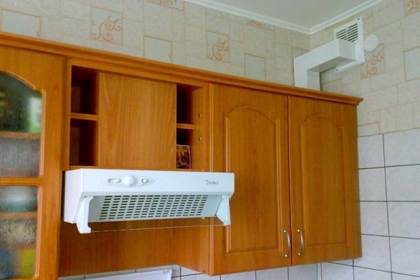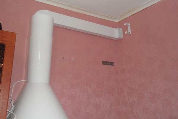 Si une partie du conduit est située au-dessus des armoires, il est plus facile de la fixer aux armoires à l'aide de supports et de vis autotaraudeuses sur du bois de courte longueur. Une boîte en plastique dans cette position ne crée pas de pression latérale importante.