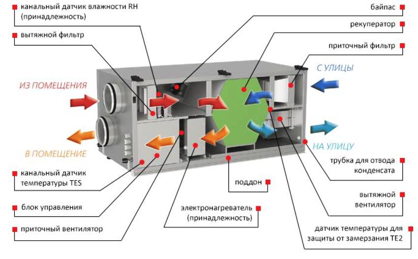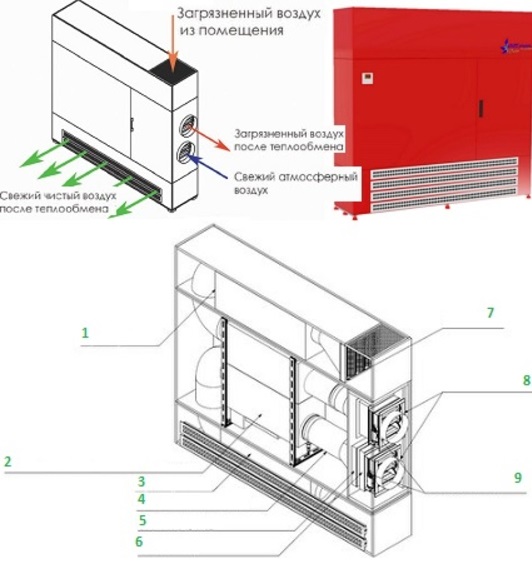- Chauffage. Le récupérateur de conduit d'échappement dégage la chaleur «d'échappement» aux masses d'air frais. Un chauffage supplémentaire de l'air est possible à la sortie du PVU avant d'être introduit dans la maison.